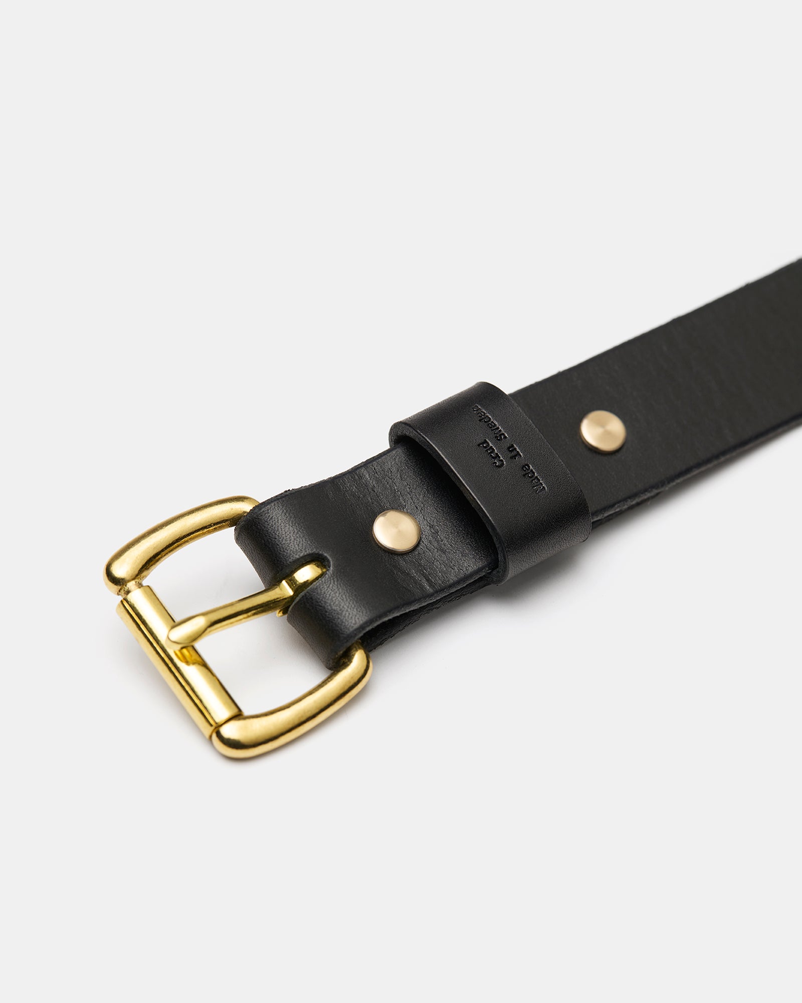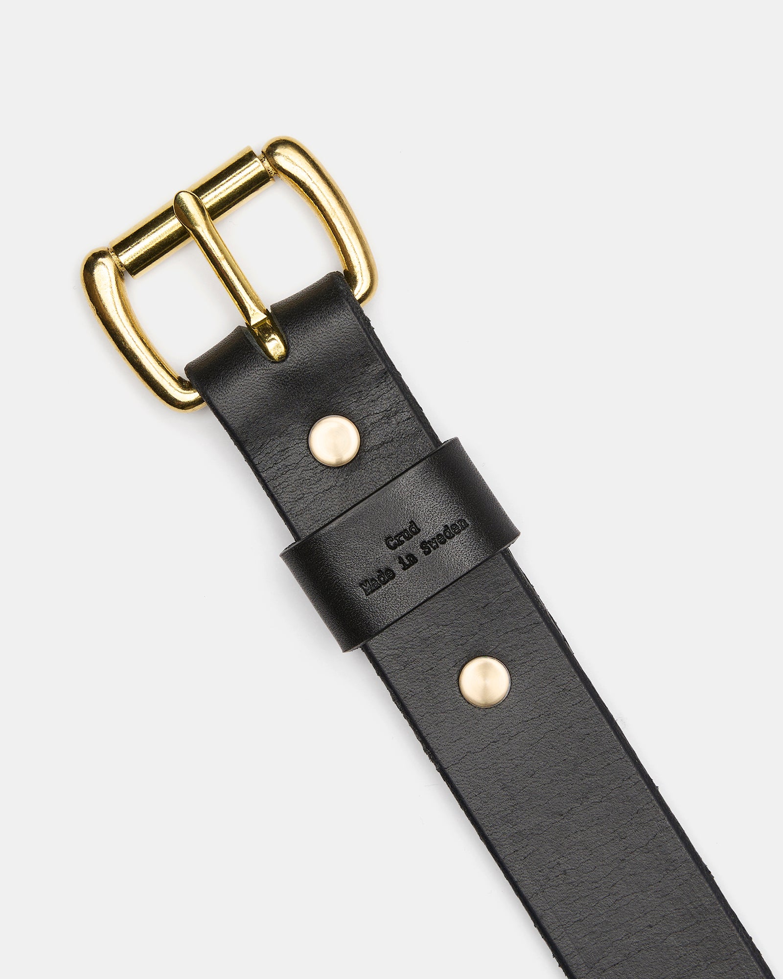 Crud leather belts are made out of 3,5mm thick Swedish Veg tanned leather from Tärnsjö Tannery and is fitted with a brass roller buckle and secured with hand polished brass screw studs.
